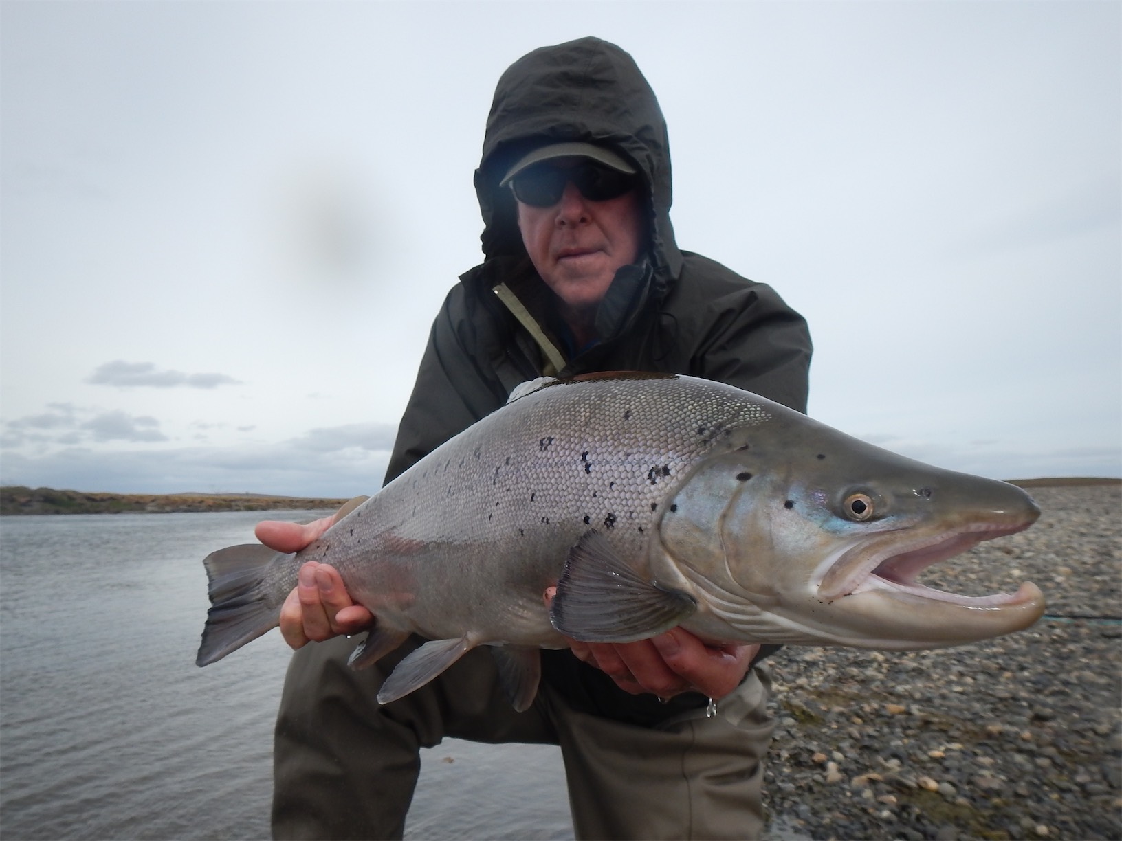 This week was incredibly unusual for the inexplicable absence of wind. The first few days were bright and sunny, with no wind. The last couple days were overcast and cool, with no wind. There was no wind in the mornings, none in the afternoons, and none in the evening. It was uncanny, freakish, and we wondered if all of a sudden the mother of all gales would make up for all the quiet days, but it didn’t arrive. With low, clear water, and no wind to speak of, it meant the anglers could stay well within their comfort zone and make delicate presentations with single handers without difficulty. The fish respond well and most of the anglers caught their fish of a lifetime. Notable catches were a 22lb fish by Ed (who only started fly fishing 5 years ago and was one of the few to persist with a double hander- defiantly one of the quickest learners the guides have worked with!); John caught a beautiful 23lb fish on his last night and Jo landed a very unusual catch indeed. An estimated 25lb CHINOOK (no doubt very lost) found itself attached to the end of Jo’s line.